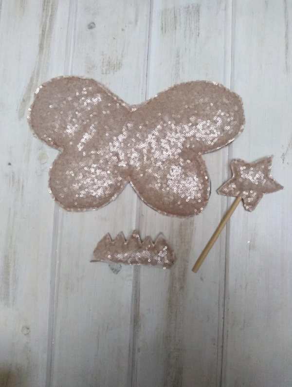 Trae un tutu con brillos dorado, alas de pallets doradas y 2 coronitas